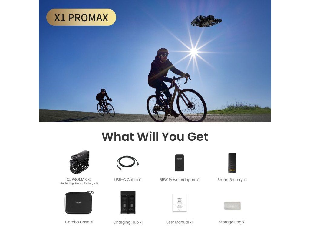 Obsah balení: HOVERAir X1 Pro Max (s baterií), kabel USB-C, náhradní baterii, Hub pro nabíjení baterií, 65 W napájecí adaptér, Combo pouzdro, návod k použití.