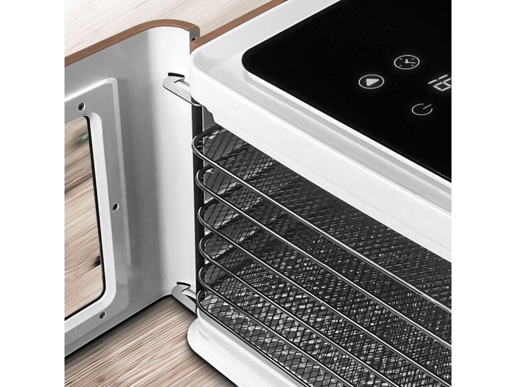 přední dvířka s průhledným průzorem umožňují lepší kontrolu průběhu sušení a stavu sušených potravin
