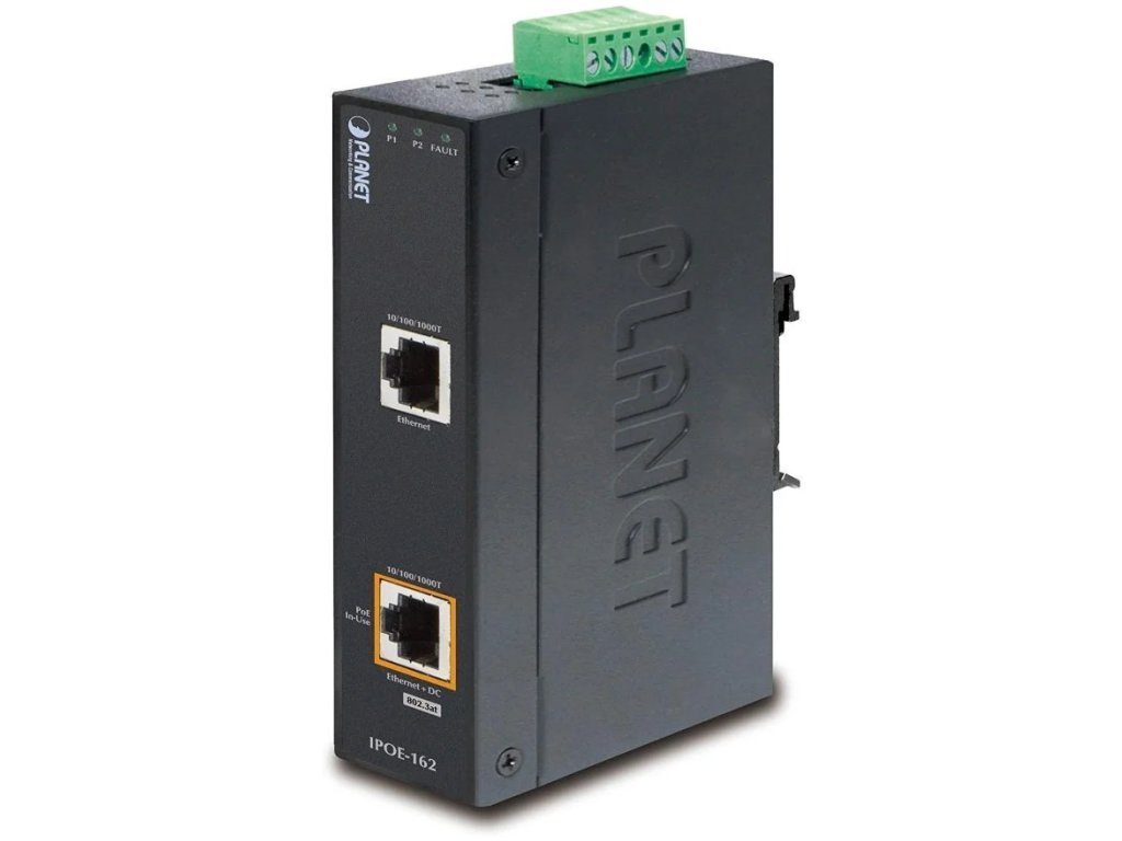 Průmyslový injektor pro napájení po Ethernetovém kabelu, standard IEEE 802.3at do příkonu až 30 W, pracuje i na Gigabitovém propojení.Krytí IP30, hliníková skříň, pracovní teplota -40 až +75 °C, montáž na DIN lištu nebo přímo na zeď.