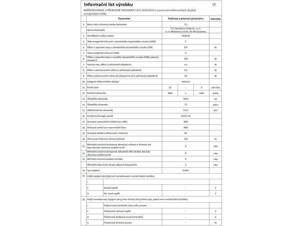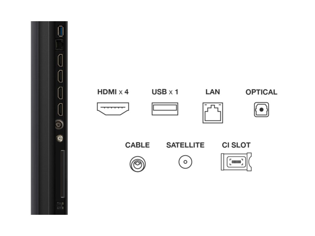 Televize – Google TV, Mini LED, 191cm, 4K Ultra HD, 100/120 Hz (144 Hz – herní režim), HDR10+, Dolby Vision, lokální stmívání, antireflexní obraz, DVB-T2/S2/C, 4× HDMI, 1× USB, LAN, WiFi, Bluetooth, DLNA, Chromecast, Miracast, HbbTV 2.0.3, herní režim, hlasové ovládaní, Google Assistant, Apple Airplay 2, párování s mobilním zařízením, Oneplay, VESA 300×300, repro 40 W, DTS:X, DTS Virtual:X, Dolby Atmos, Prostorový zvuk, vestavěný subwoofer, energetická třída EDoplňkové parametry