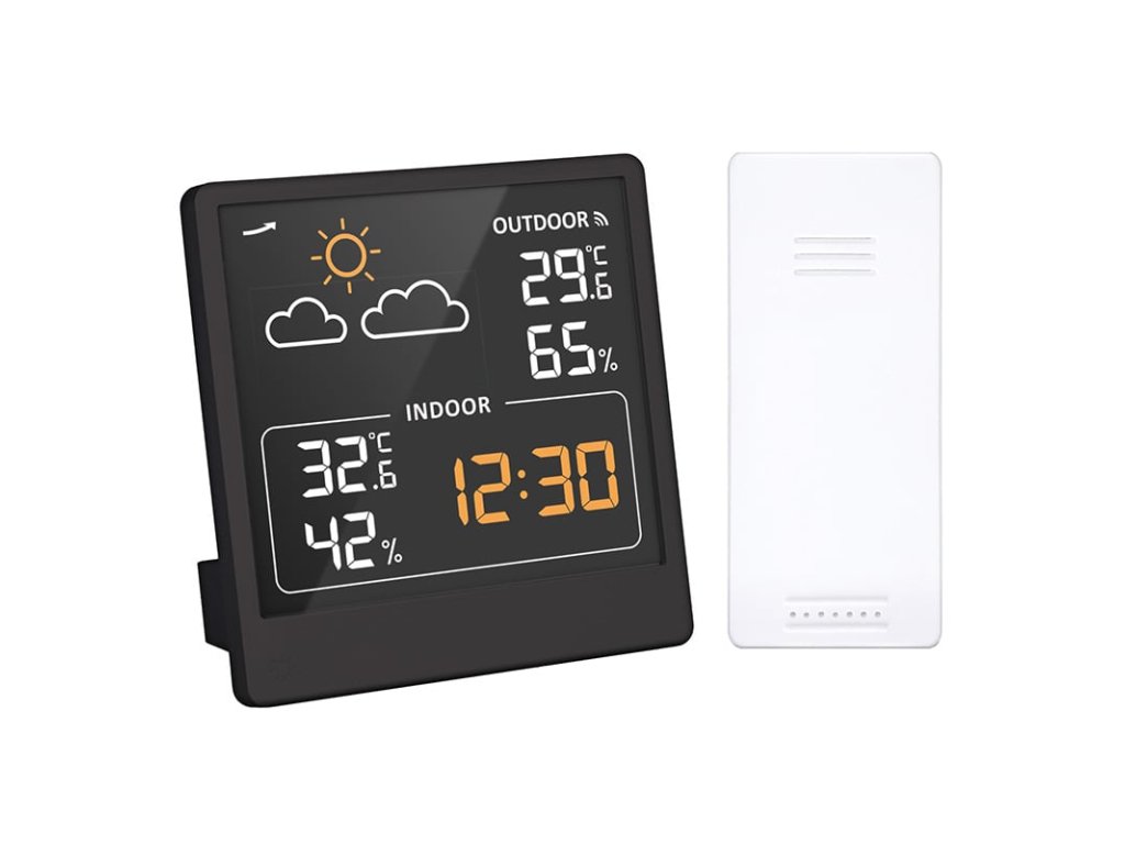 TeploměrMěření vnitřní teploty od -9,9°C do +50°C a venkovní teploty od -40°C do +70°C. Měření vlhkosti (20% až 95%) pro vnitřní i venkovní prostředí. Ukládání maximálních a minimálních hodnot teploty a vlhkosti, zobrazení trendu změny tlaku a předpověď počasí na základě změn tlaku. Možnost volby jednotek teploty °C/°F. Napájení: hlavní jednotka 2× AAA baterie nebo DC5V / 2A, senzor 2× AAA baterie (není součástí balení). Barva: černá.