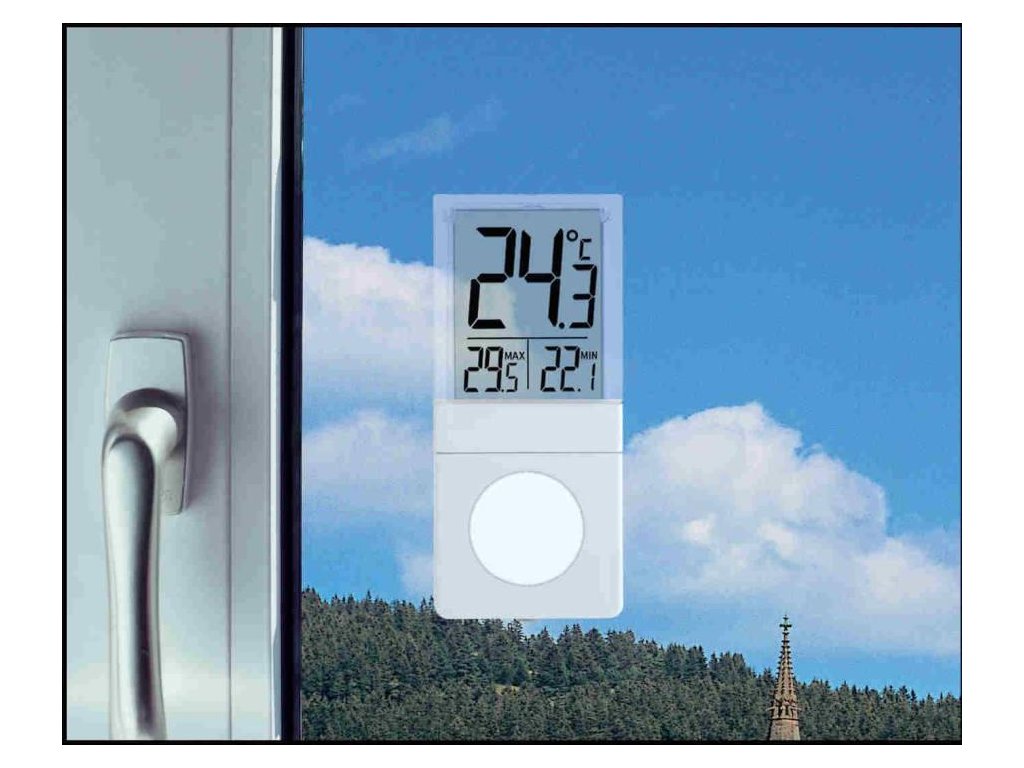Digitální teploměr na okno TFA 30.1030 je dobře čitelný a pamatuje si maximální a minimální naměřené hodnoty, které sám automaticky resetuje (denní minima v 20:00, maxima v 8:00). Teploměr je odolný povětrnostním vlivům, na okno se nalepuje jen jeho držák, do kterého se teploměr zasune. Při umývání okna se zase může vysunout a na okně je pouze držák o velikosti 40x35mm. Ideální teploměr pro plastová okna, není totiž potřeba nic vrtat, šroubovat atd. Technické informace Rozsah měření: -20 °C až +50 °C Rozměry: 90 x 40 x 14 mm Napájení: 1x LR44 1,5 V baterie (dodávána v příslušenství)Doplňkové parametry