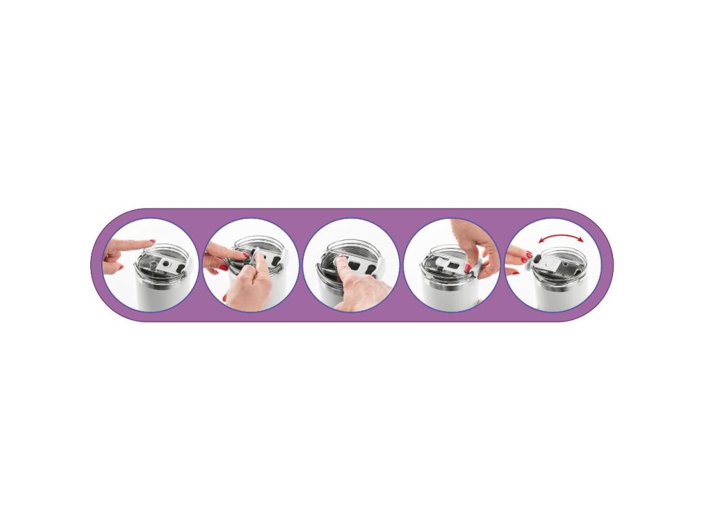 Jeho výhodou je ergonomická rukojeť a praktické brčko uvnitř hrnku, které lze snadno zasunout, když se nepoužívá. Nápoje lze z hrnku konzumovat nejen přes brčko, ale i zavírací otvor ve víčku.