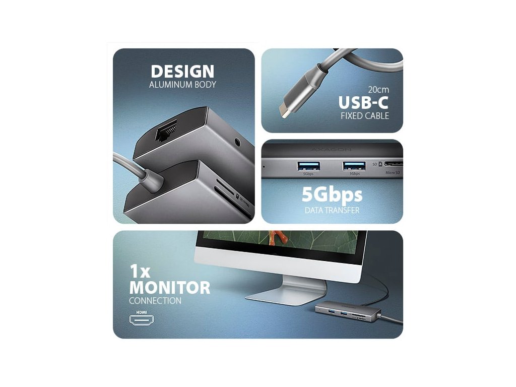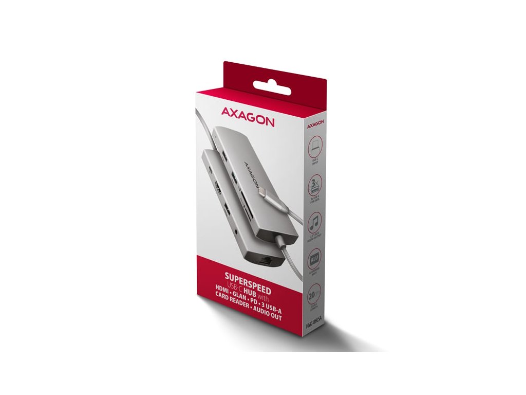 AXAGON HMC-8HLSA, USB 5Gbps hub, 3x USB-A, HDMI 4k/60Hz, RJ-45 GLAN, SD/microSD, audio, PD 100W (HMC-8HLSA)