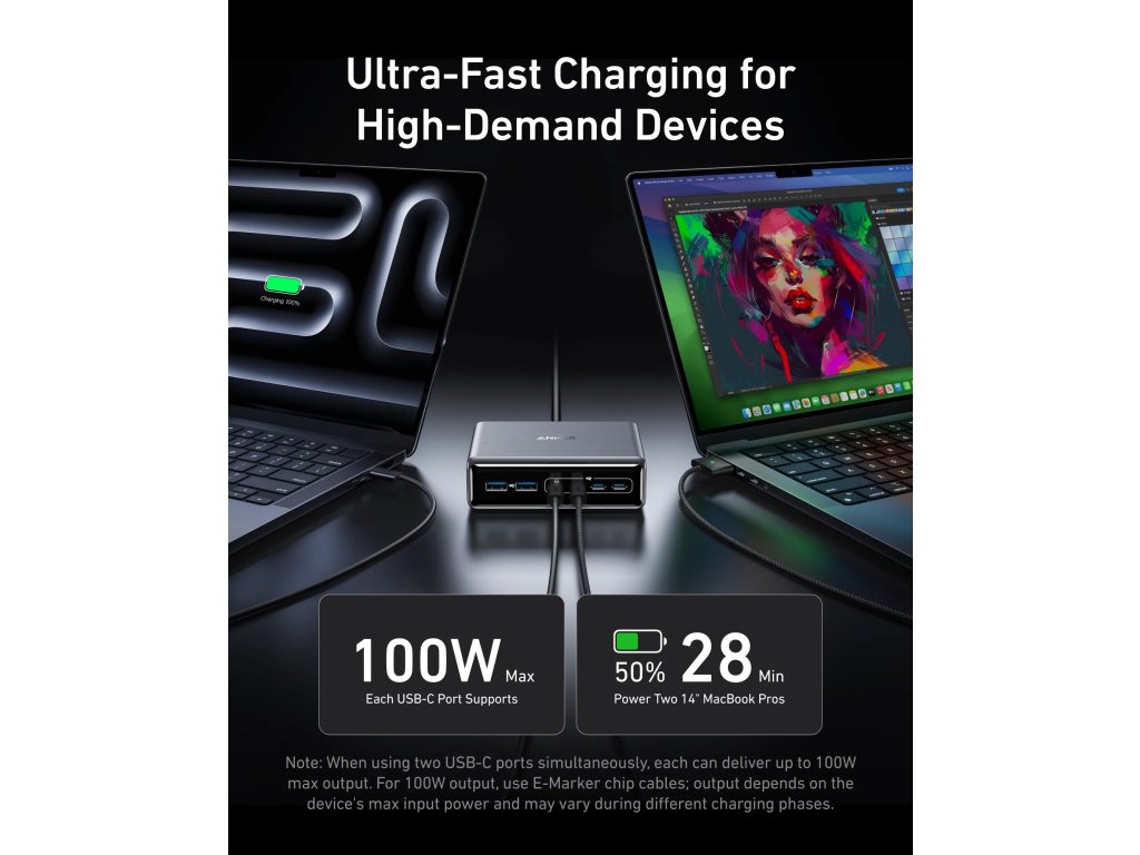 Při současném použití dvou portů USB-C může každý poskytnout maximální výkon až 100 W. Pro výstup 100W použijte čipové kabely E-Marker; výstup závisí na maximálním vstupním výkonu zařízení a může se lišit během různých fází nabíjení.