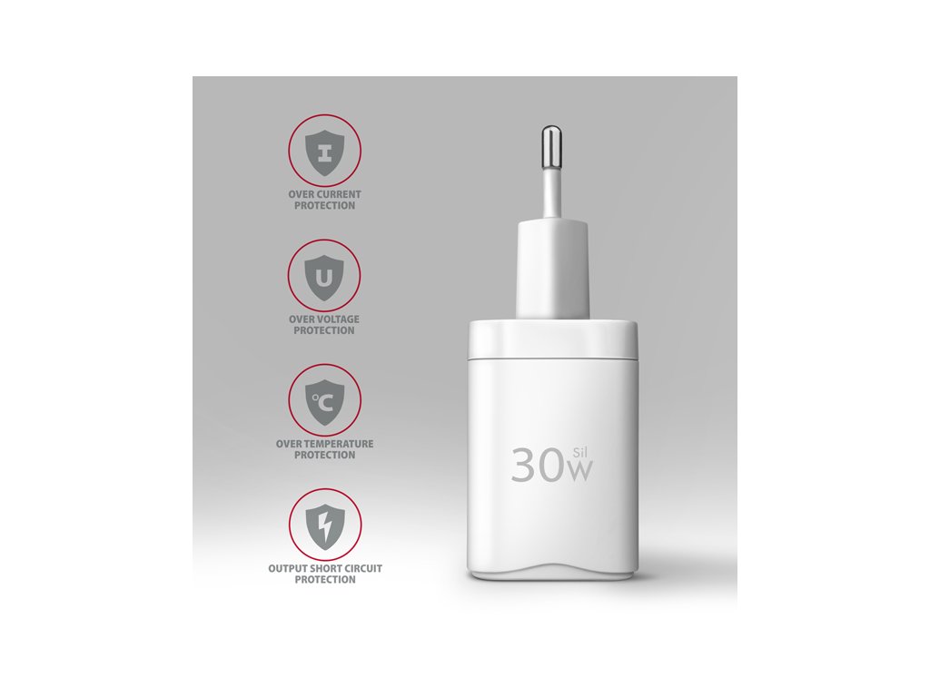Kompaktní USB nabíječka do sítě AXAGON ACU-PQ30W Sil pro rychlé nabíjení až dvou mobilních zařízení současně. Díky celkovému výkonu 30W nabíječka dobíjí telefony, tablety a další mobilní zařízení nejvyšší možnou rychlostí. Adaptér nabízí nejen standardní USB-A konektor, ale také oboustranný USB-C konektor.Kompaktní velikost a vysoký výkon je daný použitou novou Sil technologií. Super silicon využívá vyspělé materiály na bázi křemíku. Nabíječka tak může dosáhnout menších rozměrů a současně bezpečného, stabilního a rychlého nabíjení. Účinnost je tak shodná s GaN technologií při zachování příznivé ceny. Nabíječka je vybavena výstupy Power Delivery 3.0 / Quick Charge 4+ USB typu C a Quick Charge 3.0 USB typu A, což umožňuje rychlé nabíjení smartphonů a tabletů výkonem až 30W.