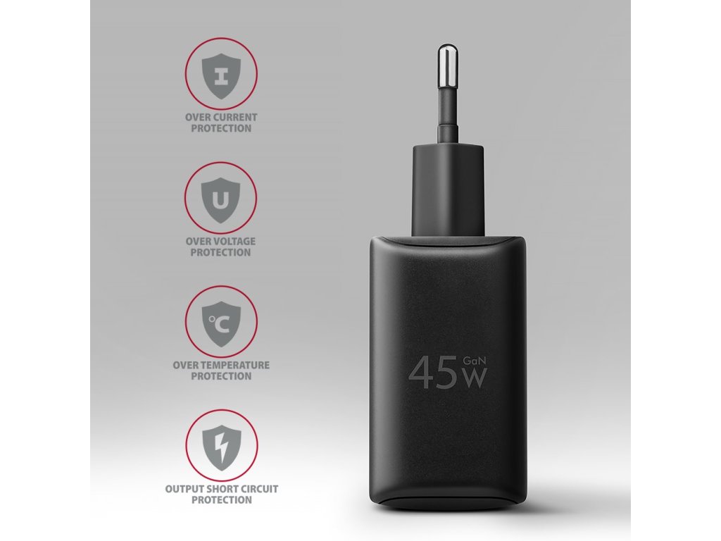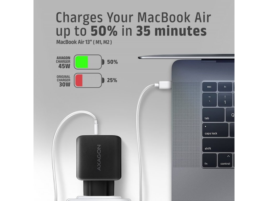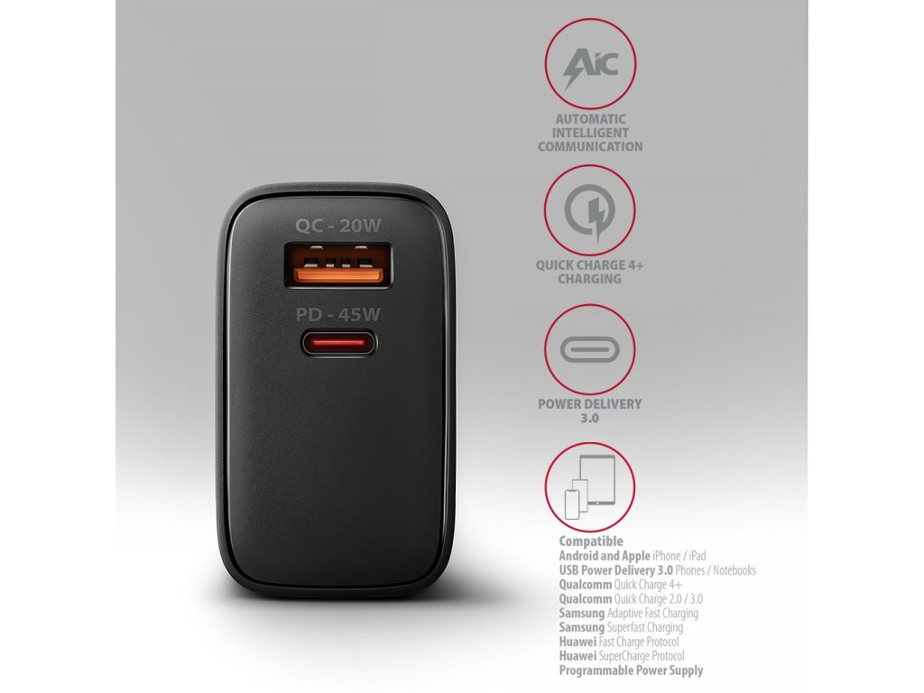 Cestovní nabíječka do sítě AXAGON ACU-PQ45 GaN umožňuje rychlé nabíjení až dvou mobilních zařízení současně. Díky celkovému výkonu 45W dokáže nabíječka dobíjet telefony, tablety a další mobilní zařízení nejvyšší možnou rychlostí. Adaptér nabízí nejen standardní USB-A konektor, ale také oboustranný USB-C konektor.Kompaktní velikost a vysoký výkon je daný využitím nové GaN technologie. Použité součástky s Nitridem Galia pracují s vysokou účinností, což umožňuje dosahovat vysokých výkonů při malé velikosti. Nabíječka je vybavena výstupy Power Delivery 3.0 / Quick Charge 4+ USB typu C a Quick Charge 3.0 USB typu A, což umožňuje rychlé nabíjení nejen smartphonů a tabletů, ale také malých notebooků výkonem až 45W.