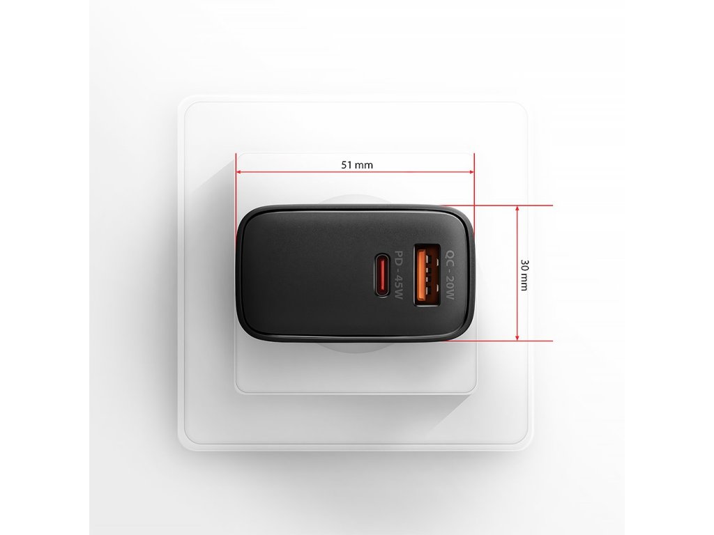 Tělo napájecího adaptéru má příjemný tvar a kompaktní velikost. Ve srovnání s klasickými nabíjecími adaptéry se stejnými parametry je velikost této nabíječky až o polovinu menší. Kombinace malých rozměrů, dosažených pomocí GaN technologie, a širokého rozsahu vstupního napětí, dělá z této nabíječky ideálního pomocníka na cesty.