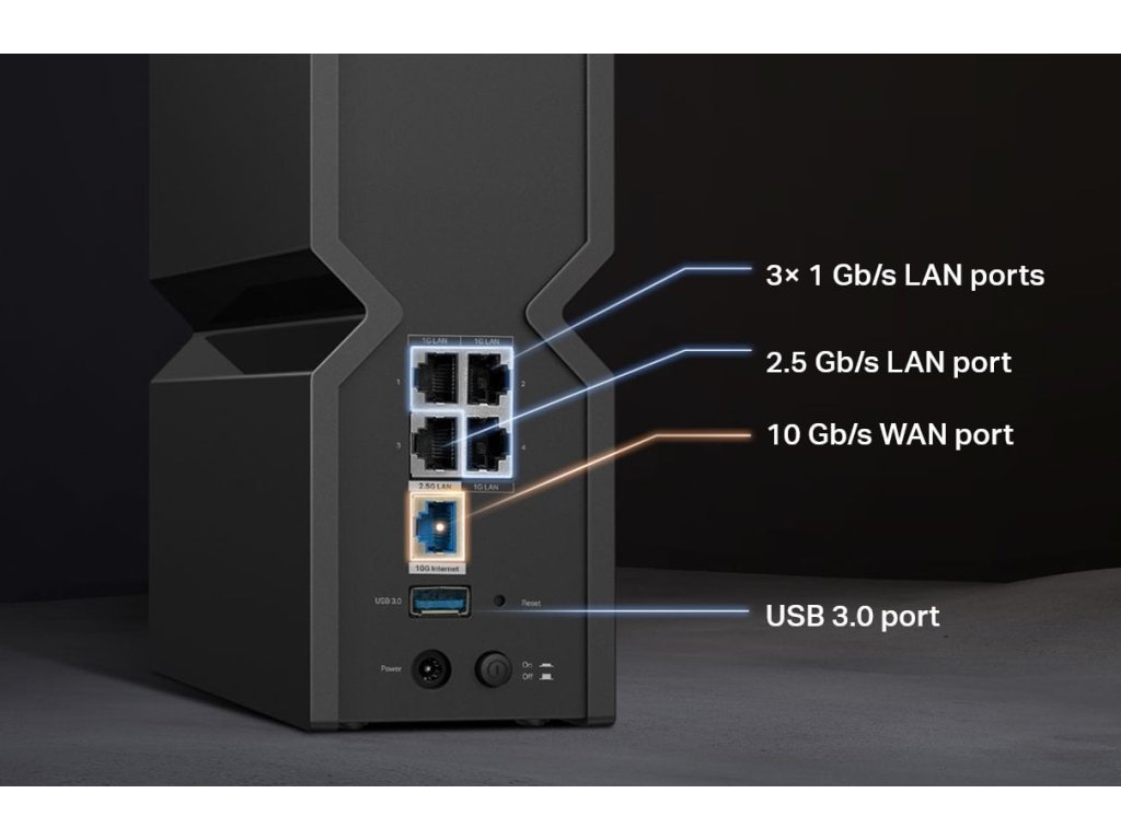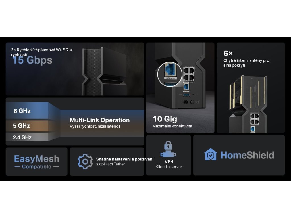 Wi-Fi 7 Tri-Band Multi-Gigabit router značky TP-Link, který je vybaven 3× 1 Gbps × 2.5 Gbps LAN, 10 Gbps WAN a USB 3.0 portem. Bezdrátová část umí pracovat ve třech pásmech zároveň a s rychlostmi 688 Mbps ve 2.4 GHz pásmu, 2 882 Mbps v pásmu 5 GHz a 11 528 Mbps v pásmu 6 GHz díky použití 320 MHz širokým kanálům a 4x4 MU-MIMO. Router podporuje IPv4 i nejnovější IPv6 routování. Router kromě nejpoužívanějšího modu AP Router podporuje i režim Access point a podporuje i nejnovější VPN servery.Klíčové vlastnosti