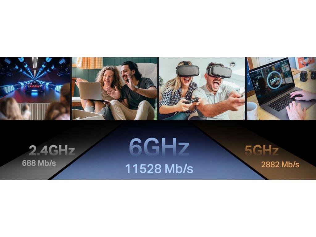 Tři pásma Wi-Fi 7 (802.11be) - 11 528 Mbps (6 GHz) + 2 882 Mbps (5 GHz) + 688 Mbps (2.4 GHz)